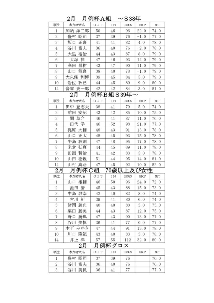 2026年2月「月例杯」成績表
