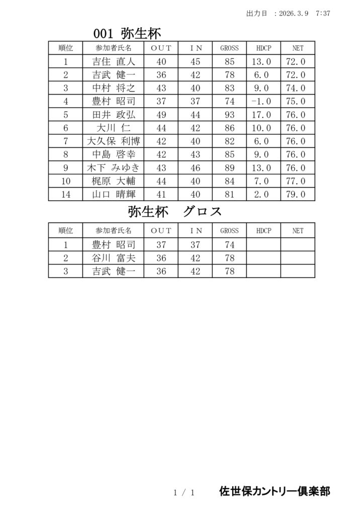 2026年3月「弥生杯」成績表