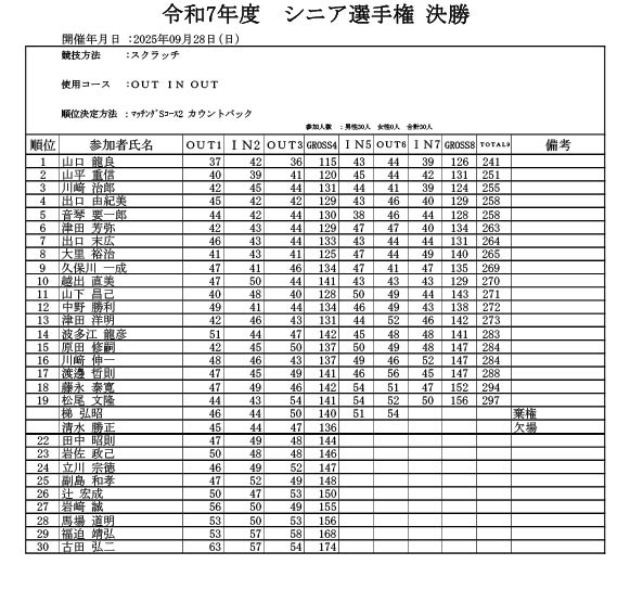 2025年9月「SGシニア選手権」成績表