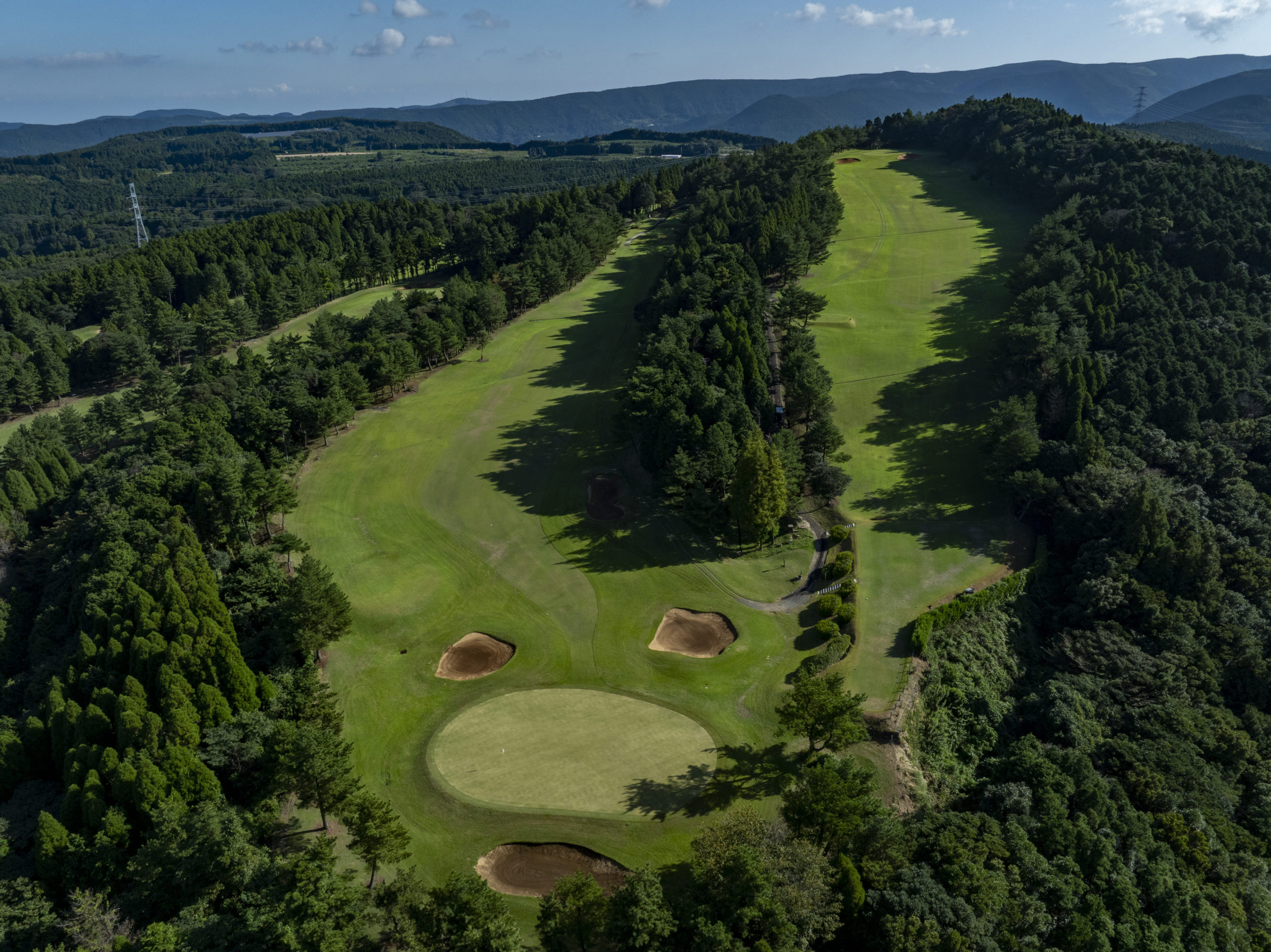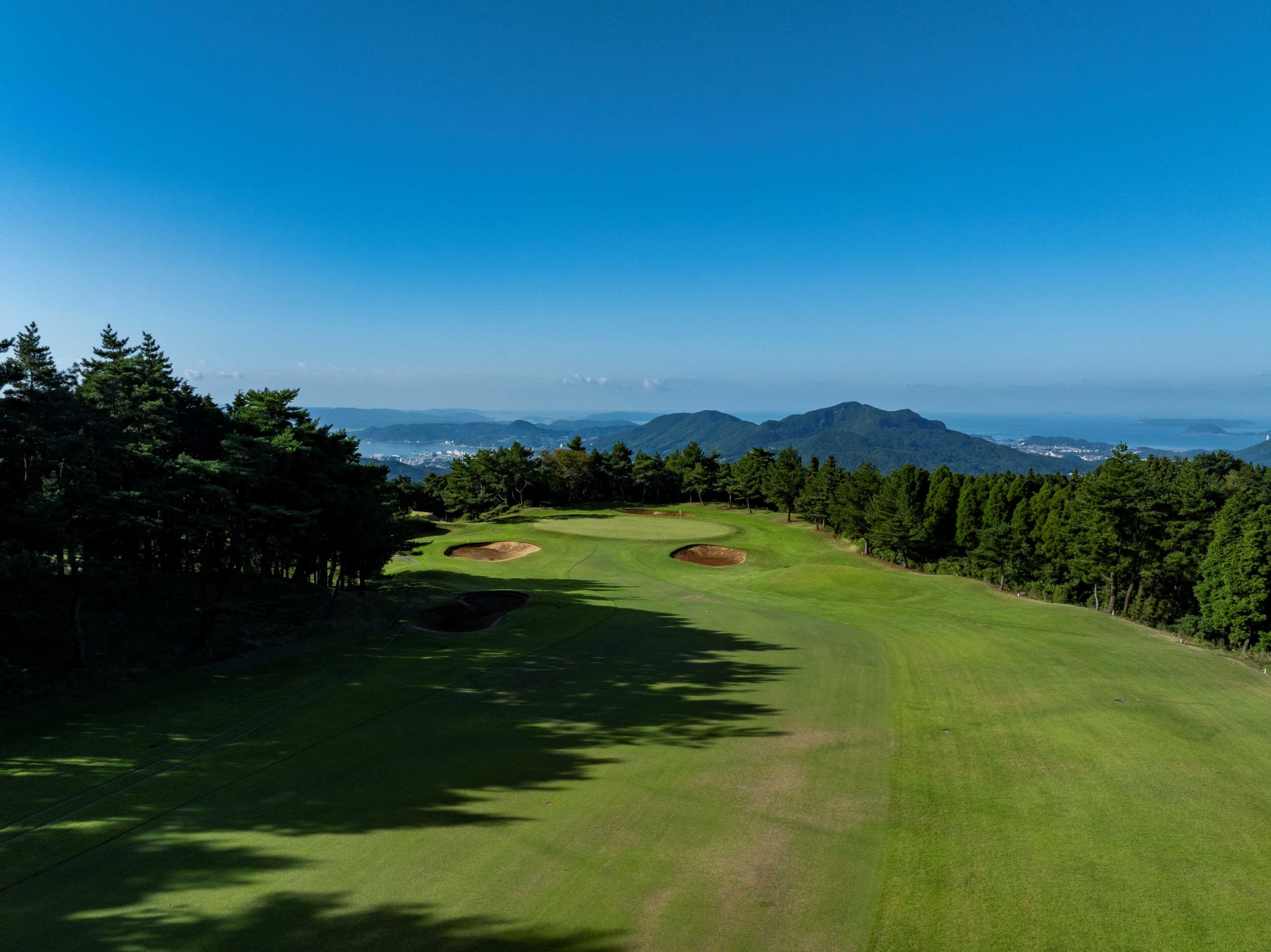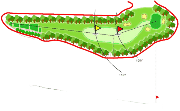 ティーマークの位置によってはアイアンで打つことも。2打目は左足下がり(右打ちの方)になるので球から目を離さない。ティーショットがOBの場合は前進4打。