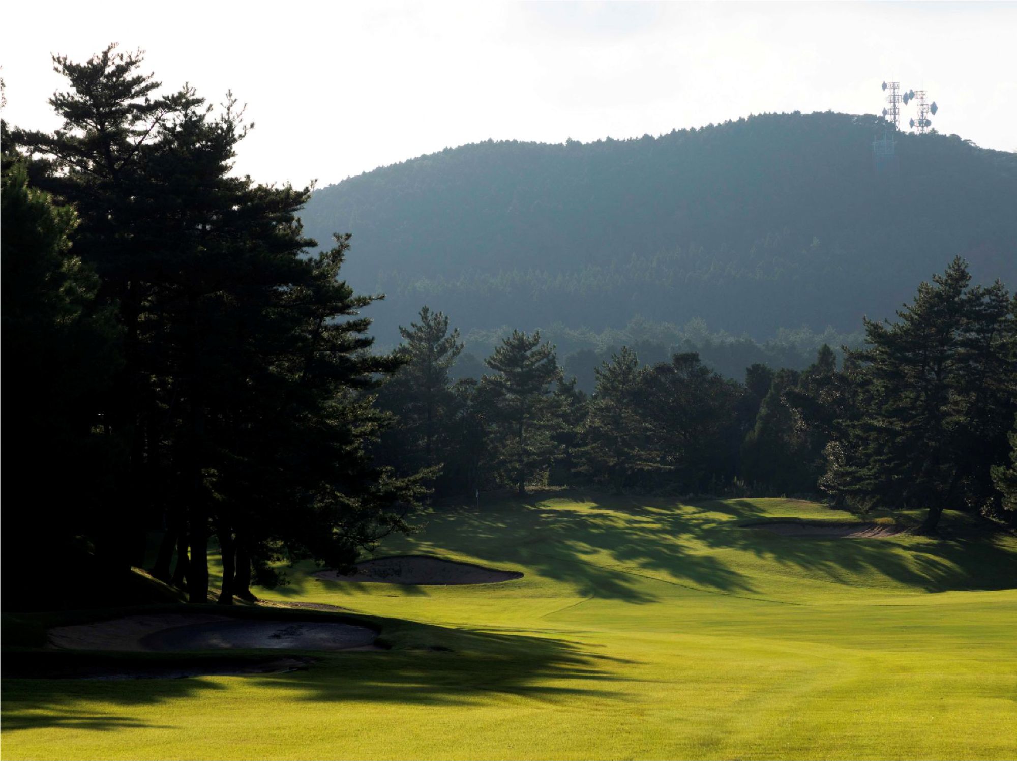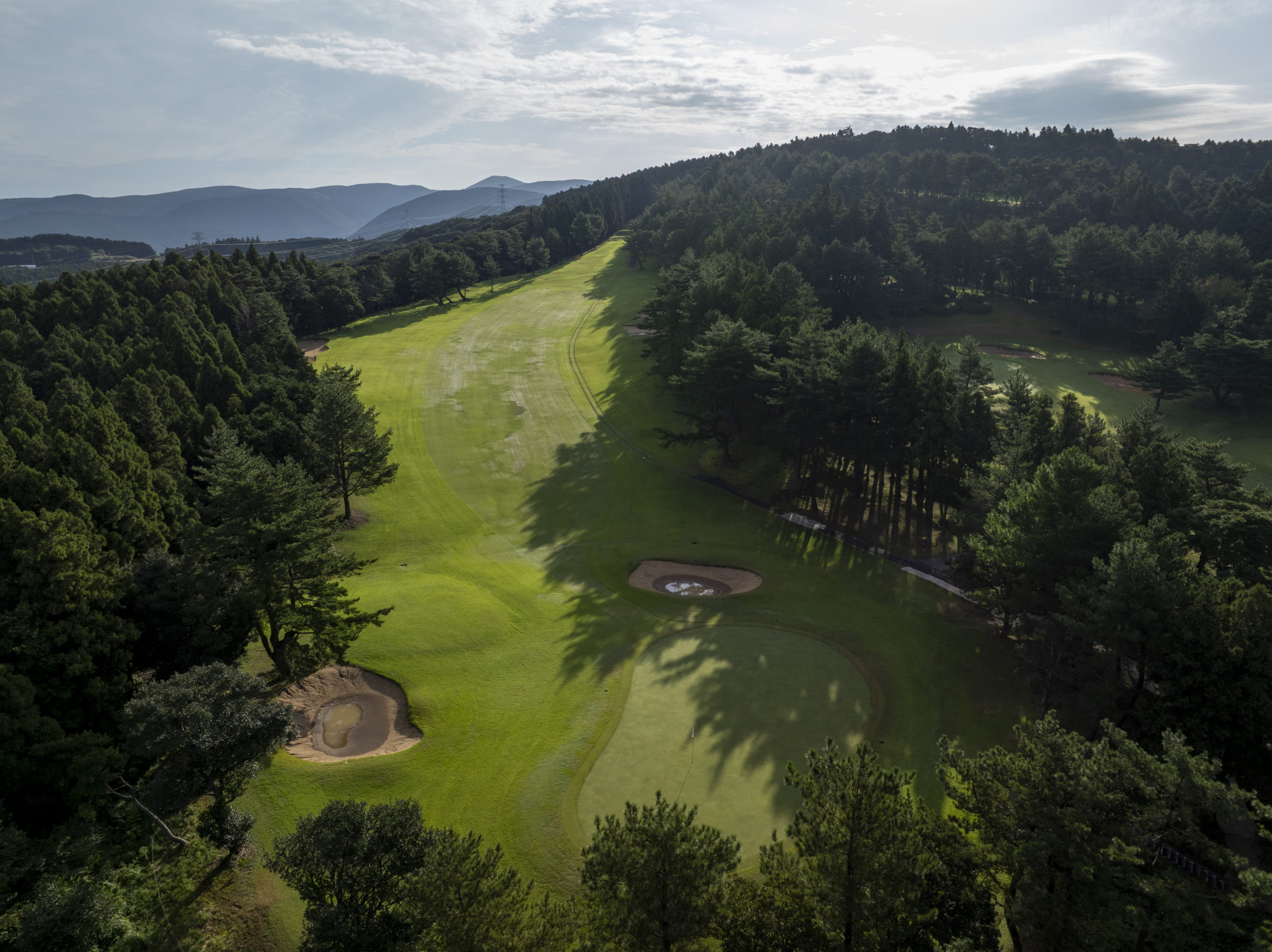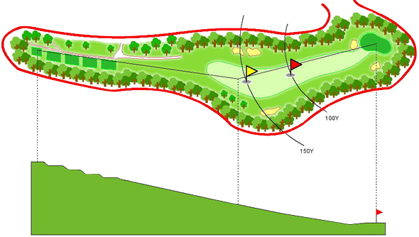 左側2個のクロスバンカーとOBラインに注意。ピンの位置が左側の場合、 手前のガードバンカーと奥がすぐOBになっているので正確な距離を要する。 ティーショットがOBの場合は前進4打。